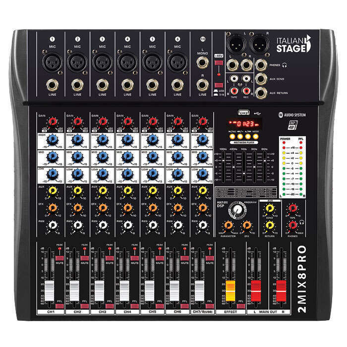 Equipped with a digital DSP Multi FX processor, the Italian Stage 2MIX lineup also works as a 2 + 2 channel USB audio interface for DAW recording / playback. The 4, 6 and 8 channel models also include USB audio with an integrated recorder / player able to record MP3 files directly on USB flash drives. You can play MP3 files as backing tracks, or play background music during live breaks.