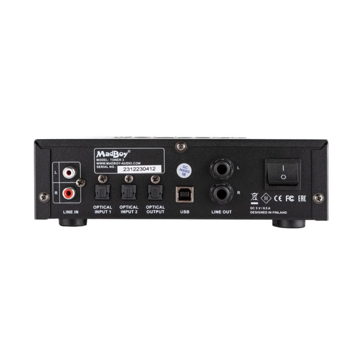 You can operate the device from the front panel, with the remote control or with the MadBoy Key Control Windows application. The USB connection not only enables easy adjustment, but also offers the possibility to connect a computer as a sound source or recorder. Balanced and optical output provides a disturbance-free signal when connected to sound system.