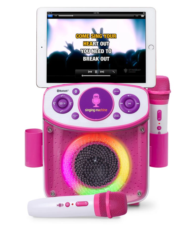 The Singing Machine SML294 Sparkle lets you be the main spotlight with 6 fun voice-changing effects for endless fun. Discover the sparking voice inside of you with the lead vocal off feature, which lets your voice shine through the song. Record and playback your singing performances. Enjoy a light show that synchronizes to the beat of the music. Connect your Bluetooth device and sing along to your favorite karaoke songs. Who doesn’t love a good duet, with two wireless microphones included you are sure to keep the party going! Create fun, lasting, singable moments with The Singing Machine Sparkle!